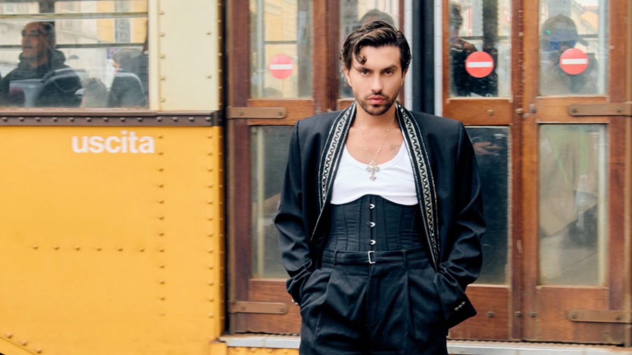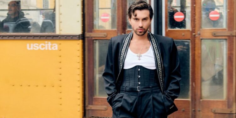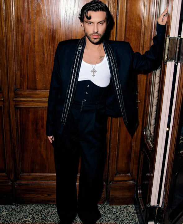 Para compor o visual, ele apostou em peças da própria grife italiana: um corset masculino, blazer estruturado, calça de alfaiataria preta, regata branca e sapatos clássicos. O resultado foi um look sofisticado e impactante, que atraiu olhares no evento. “Esse é o meu debut numa fashion week, quis estrear com um look à altura do evento. Adorei ver de perto o desfile da grife e a conexão da arte das telas com esse segmento”, disse o ator, entusiasmado com a presença de Meryl Streep no local, que gravava cenas para a continuação do filme “O Diabo Veste Prada”.