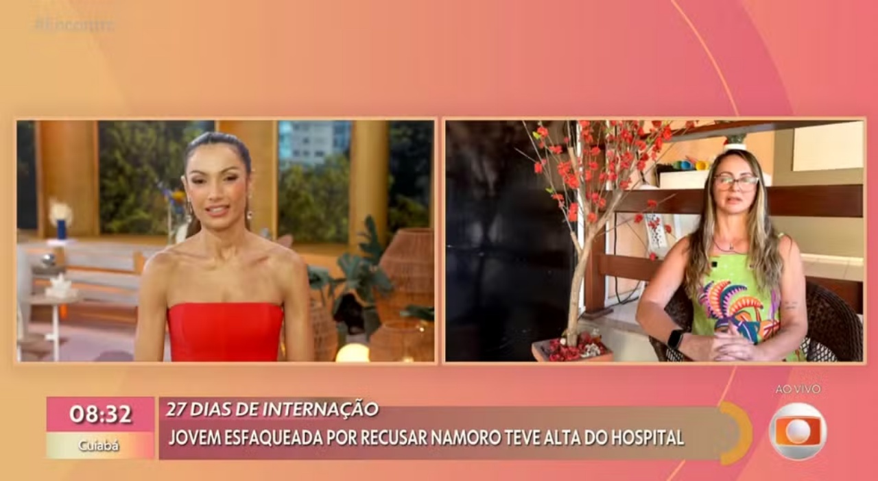 Resumo: A apresentadora Patricia Poeta entrevistou no Encontro a mãe de Alana Anísio Rosa, jovem que sobreviveu a um ataque com mais de 30 facadas no Rio de Janeiro. Após quase um mês internada, a vítima recebeu alta e segue em recuperação. A família agora concentra esforços na fisioterapia e nos cuidados médicos necessários para a recuperação completa.