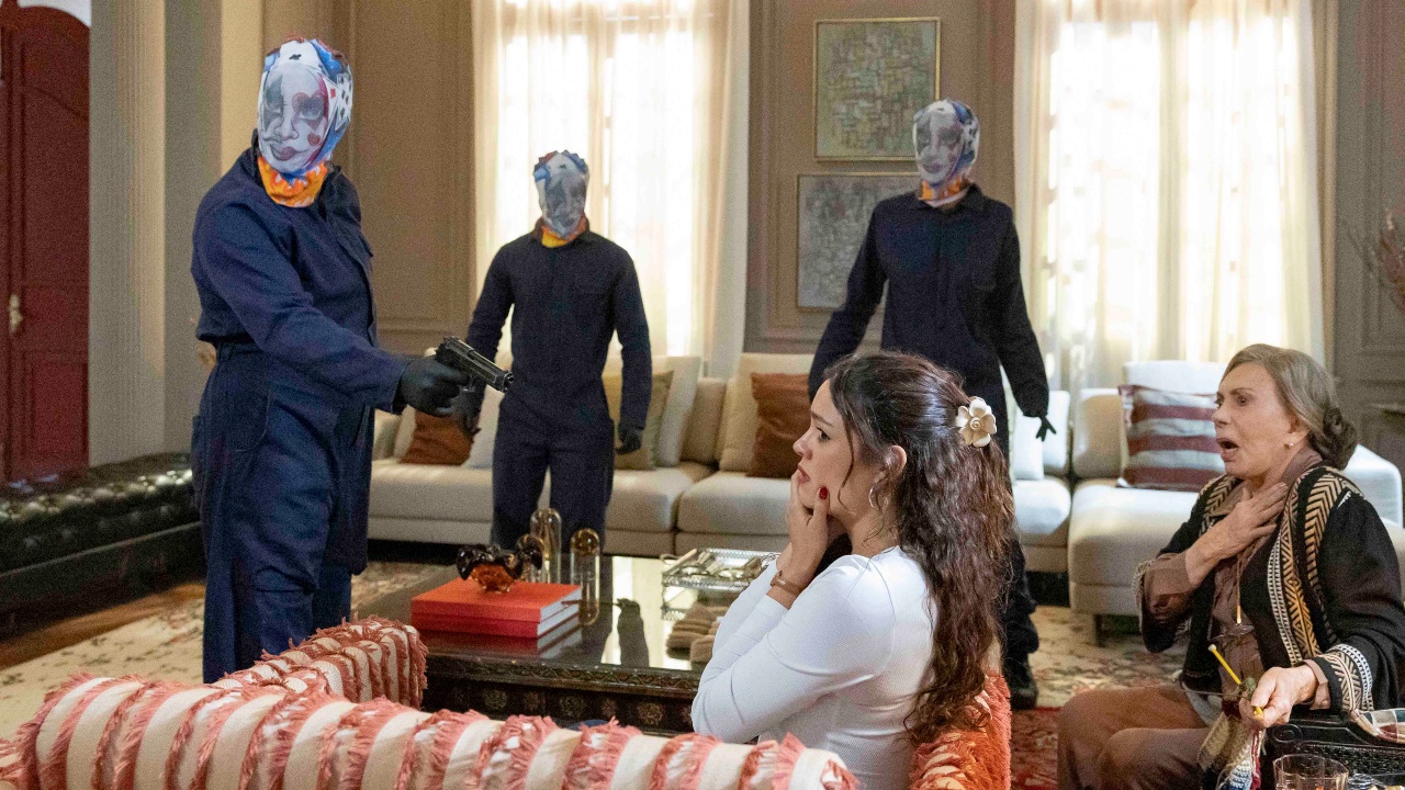 A primeira pessoa que avista o bando entrando na mansão, usando máscaras, é Arminda, que pensa se tratar de uma brincadeira. Quando Joaquim ameaça Gerluce, ela percebe que é um assalto. Raul (Paulo Mendes) aparece para conferir o que está acontecendo e fica na mira dos quatro.